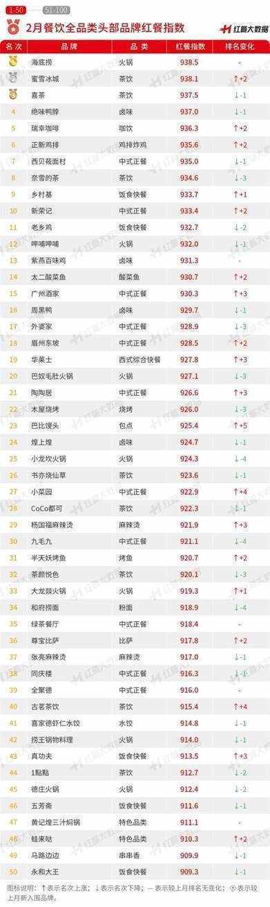 总体上看,在2月“餐饮品类的品牌力百强榜”中,名次上升的品牌有37个,名次下降的有47个,名次不变的有16个,本月度无新上榜品牌。