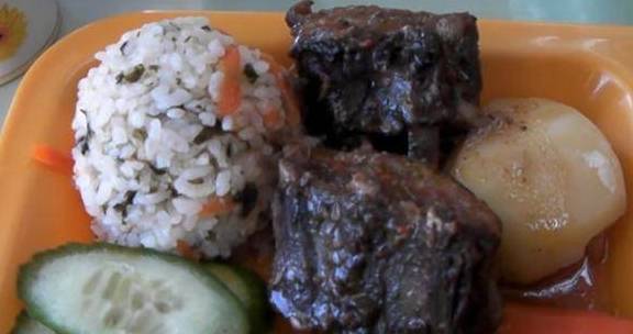 这是一份米饭套餐,包括炖牛肉土豆胡萝卜,南方人吃起来可能会觉得比较油腻,味道偏重,因此还搭配了一份咸菜,用来解油腻,土豆肉汤油水也很大,这就是蒙古快餐的特点。