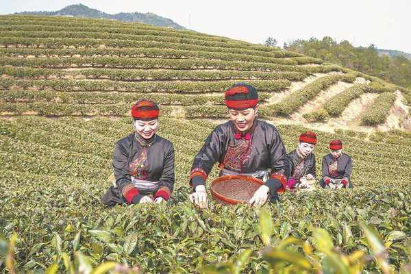 宁德市霞浦县盐田乡洋边村寨下畲族自然村举行开茶节,身着畲族盛装的男女畲民在茶山上采摘春茶(如图),吸引众多游客和茶商前来观赏、拍照和洽谈茶叶销售业务,促进畲民增收致富。