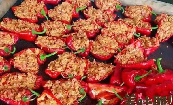 然后将米糊塞进大个红色辣椒里,然后放入太阳底下,将其晒干水分,然后再放入锅中蒸熟