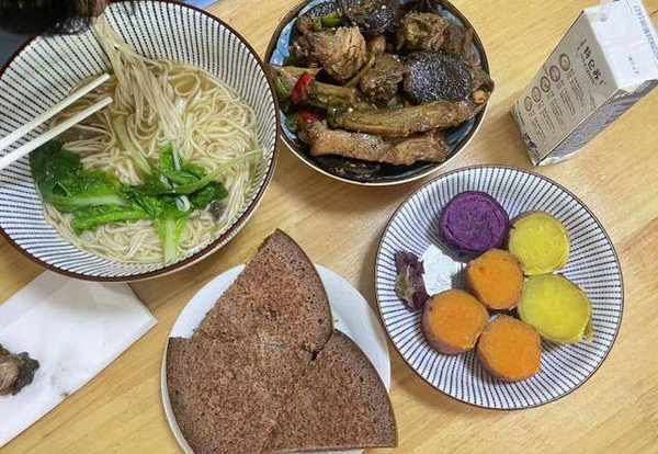 周末表妹夫在家的时候,婆婆会特意加点品种,面条、煮三色红薯,还有婆婆蒸的黑芝麻糕,晚上没吃完的鸭子,婆婆就用来当下饭菜了!大清早吃鸭子,还真是有点油腻呢。