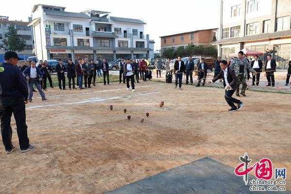 上午8时,比赛在大家的欢呼声中拉开帷幕,来自云南省楚雄州楚雄市中山镇7个村委会的7支代表队步入赛场,代表们意气风发斗志昂扬,与他们一起“战斗”的“伙伴”——陀螺屹立在身旁,时刻准备战斗。比赛开始,各参赛队分别派出一名代表,通过旋转陀螺时间的长短确定比赛顺序。赛场上,陀螺飞转,尘土飞扬,进攻方选手们用尽全力甩出陀螺,将防守方支起的陀螺狠狠击飞,两者相撞间迸发出的清脆响声与观众们的呐喊声交织在一起,相映成趣。