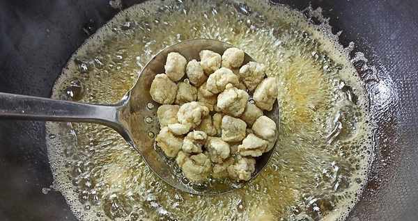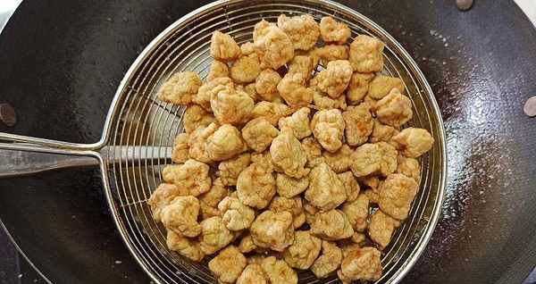 【第六步】:肉丁炸好后,开中火将肉丁炸至金黄色,捞出沥干油备用。