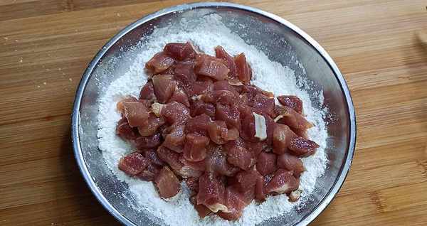 肉粒要裹上淀粉,裹好肉粒后要搓揉,使淀粉更结实。主要是好看,炸的时候不容易掉。