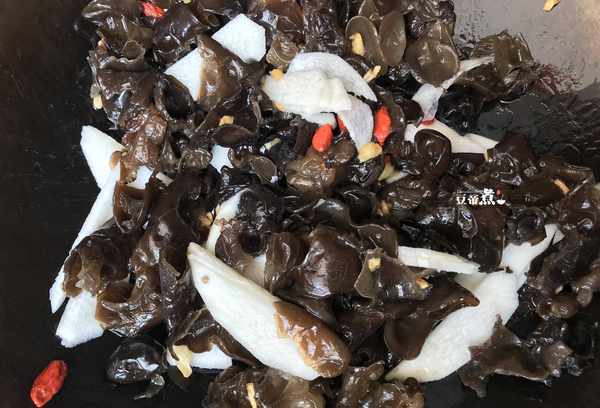 2、炒黑蘑菇的时候,如果经常听到“爆”的声音,可以加少许水一起炒。