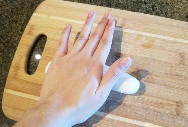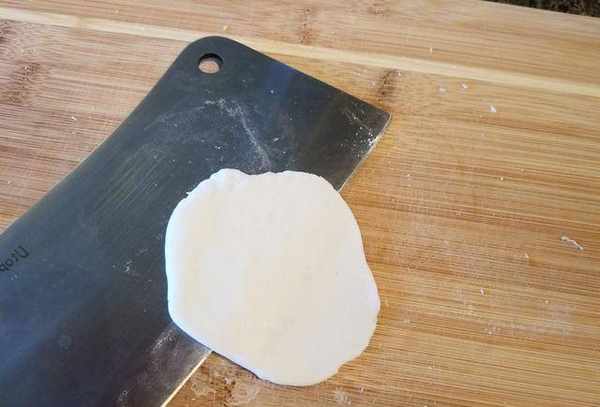 5.擀皮:在蘸板上抹少许油,将面团擀长,切成小块(约12-15克),盖上布,以免表面变干。取一小块面团,用一把又宽又扁的菜刀,用纸巾在刀面上抹一层油,将面团顺时针向下压,四面压成薄片状(这样比较容易压扁)折叠)和中间厚一点(馅料不易破裂)光滑的外皮