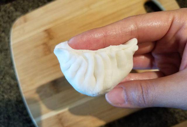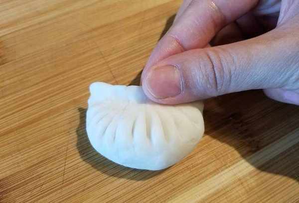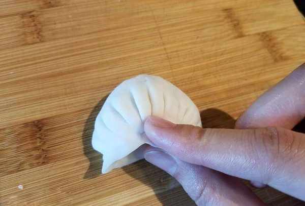 6.做虾饺:中间放馅料,每个虾饺要有2-3大块虾肉,笋片和肉末,味道会很好吃!虾饺的制作重点来了。将左手放在蛋糕上面,用右手从左到右对折小的折痕(一般的有13折,不过外行也别勉强了)。对折后,将上端压扁削薄,旋转180度,用双手将端部压成一个小钩