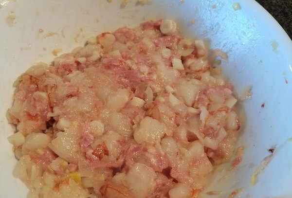 3.将虾切成2-3大块,加盐顺时针搅拌约一分钟,让虾入味,增加虾的口感。加入笋丁和肉碎,用绍兴酒、香油、糖和白胡椒粉调味,最后加入生粉,这样既可以使馅料粘在一起,又可以吸收虾肉和猪肉的汤汁。虾馅更好吃。辉煌