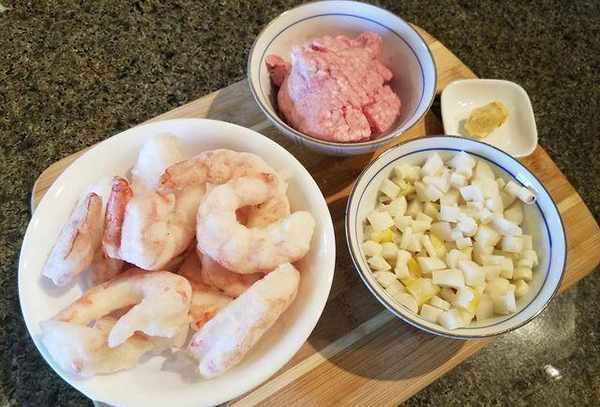 2.虾馅:将竹笋切丁。如果买不到笋,可以用嫩笋罐头,涮去辣油。虾仁去掉冰块,洗净,用纸巾擦干。姜切成粉,可以去除虾腥味
