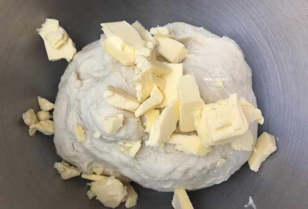 2、将面团揉至膨胀,加入室温软化的黄油,继续揉至出膜开始发酵。
