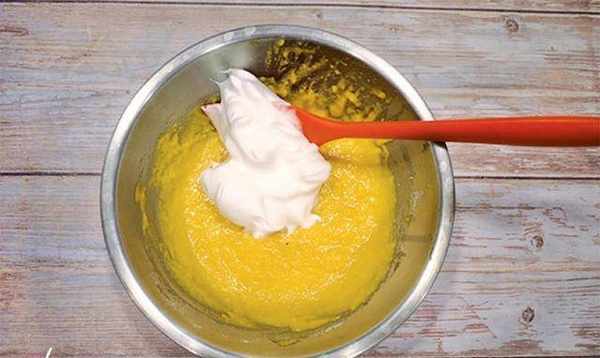 5.将蛋黄糊倒入剩余的蛋白霜中,边切边继续搅拌均匀。