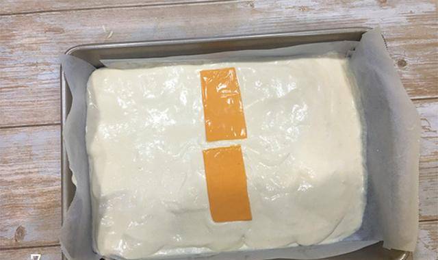 7.铺上切成两半的切达芝士片,将剩下的面团倒在上面,撒上帕马森芝士粉。