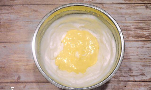 4.将1/3的蛋白霜倒入步骤2的蛋黄糊中,用硅胶刮刀搅拌均匀。