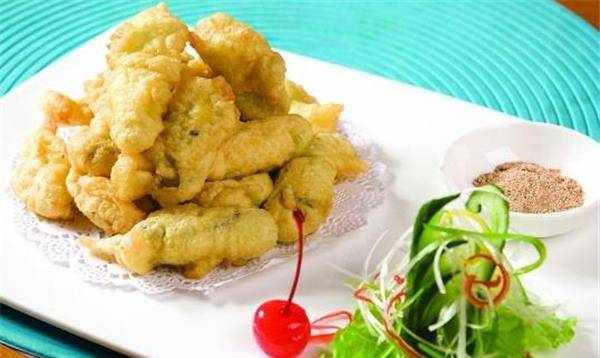 3、加入腌好的海肉拌匀,海肉用面粉搓揉,起油,油70%热时,将海肉煎至两面金黄,捞出。而且直接吃可以加盐和胡椒粉吃。