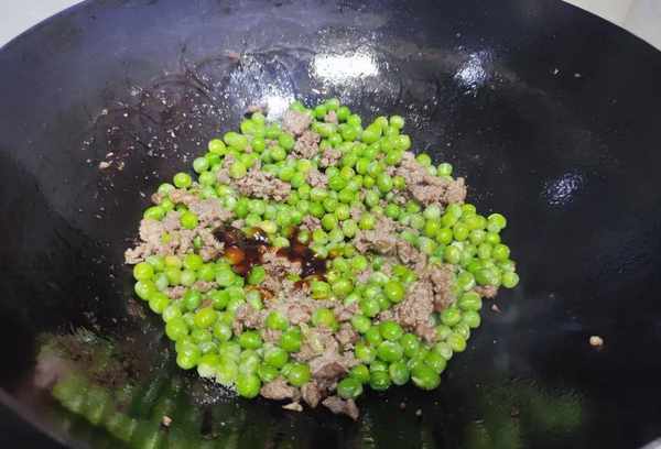 然后我们再次将豌豆倒入其中。鹰嘴豆放入锅中后,用抹刀将它们搅动并均匀煮熟。煮好后,我们在锅中倒入少许盐和骨酱调味,然后用锅铲翻炒均匀;