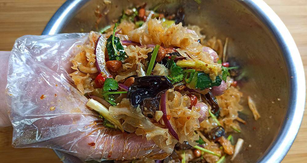 【第七步】:然后用手搅拌均匀。最好用手混合做冷色拉。混合物均匀可口。把它放在盘子里。