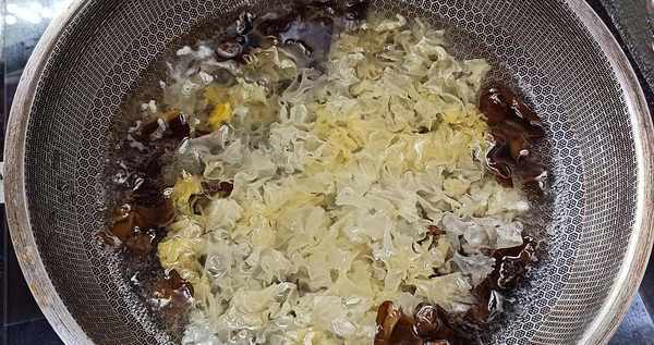 泡白蘑菇和香菇时,要用温水,不要用热水。如果用热水,会造成外熟内生,影响口感。放少许面粉,可以很好的泡发,脏东西也比较容易清洗。