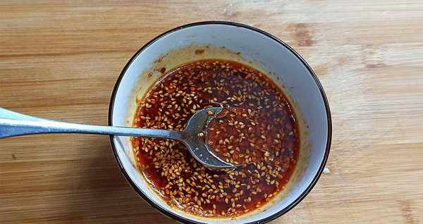 【第四步】:将热油倒入装有蒜茸和辣椒面的小碗中,以激发香料的香气,然后加入1勺盐、2勺酱油、1勺糖、1勺香醋.,和鸡汤1茶匙1茶匙,香油1茶匙,拌匀做成调味酱,下一次把花生炒熟装盘。