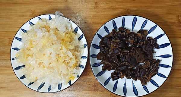 【第二步】:将白蘑菇和黑蘑菇泡水,然后摘洗干净,用手把白蘑菇撕成小花,大蘑菇撕开,单独装盘待用。