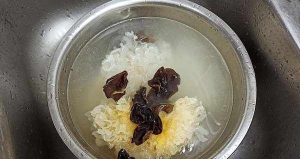 【步骤1】:将白蘑菇和白蘑菇放入碗中,加入1勺面粉,加水浸泡30分钟,再将白蘑菇和白蘑菇泡发。