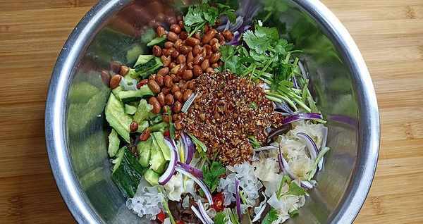 【第六步】:将白蘑菇和焯过水的蘑菇捞出放入冷水中冷却,然后捞出,挤干水分放入盆中,加入黄瓜、洋葱、香菜、坚果,拌匀酱汁也是如此。