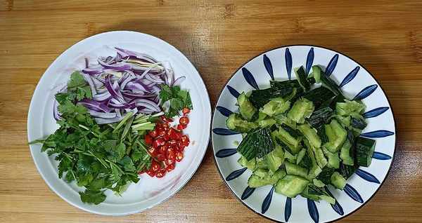 【步骤3】:取一根简单的黄瓜,切成片,洋葱切成片,细香葱切成寸片,辣小米切成圈装盘,蒜切好放入小碗。辣椒粉1茶匙,白芝麻1茶匙待用。