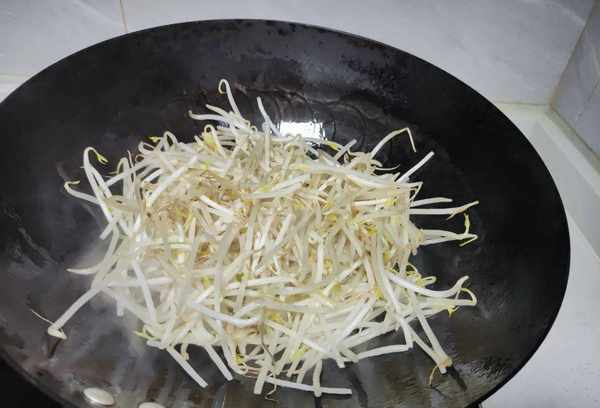 2.将油倒入锅中,加热油。油热的时候,我们直接把洗好的豆芽倒进去。豆芽的含水量很高。入锅后,大火快速搅拌,多翻动勺子,让豆芽受热均匀;