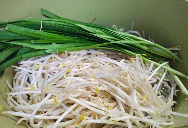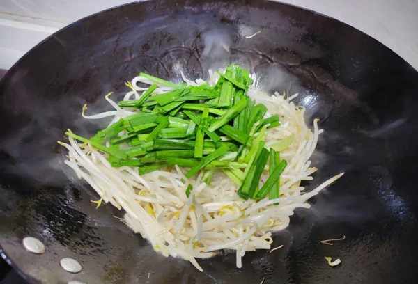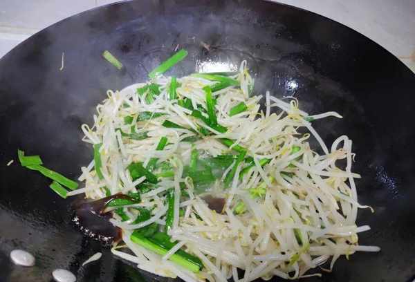 很快这样做出来的炒豆芽和韭菜就做好了。清脆多汁的豆芽和韭菜的鲜味相结合,增添了新鲜感。拿起它,把它放在嘴里,就像把弹簧咬进嘴里一样。凉爽的。