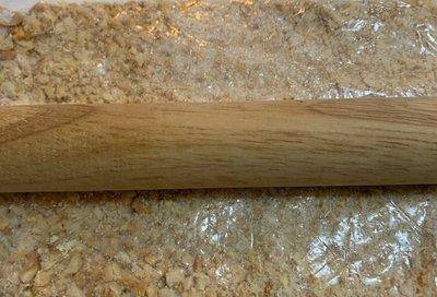 5.用棒棒打平,让花生和糖完全结合并研磨。