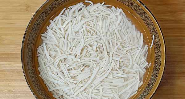 【第一步】:将内酯豆腐切成薄片,再用刀切成片,放入盛满水的大碗中待用。