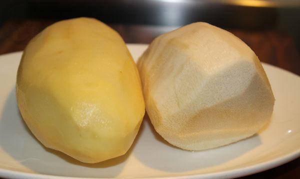 土豆和竹笋分别去掉外皮。竹笋若布满纤维、老化,应将纤维部分切掉,洗净,切成厚片备用。