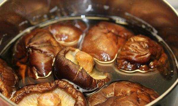 实际上有很多类型的香菇。图中的是埔里的干香菇。用温水泡软,泡香菇的水留着备用。