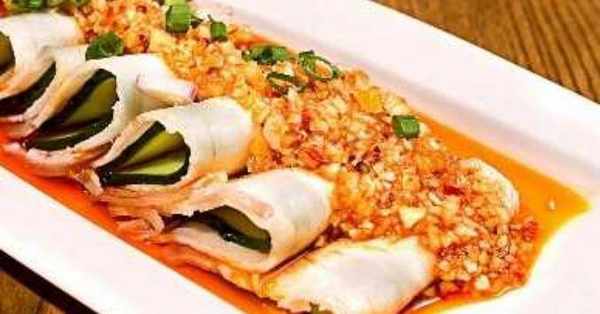 3、提前调好一碗酱汁,将大蒜、酱油、红糖、盐放入碗中,加入少许高汤搅拌均匀,再加入油性辣椒酱、红油,黄瓜洗净用削皮器切片切成细长片,装盘,将酱汁浇在肉片上即可食用。