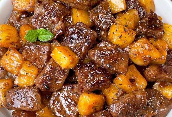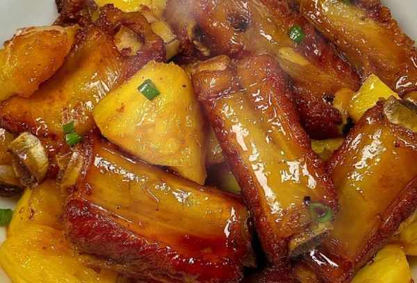 6.炖煮熟后,放入菠萝翻炒片刻,约一分钟,最后开大火爆炒收汁,即可出锅装盘。