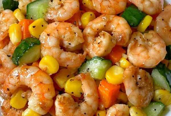 5、锅底加油,放入蒜末炒香,再放入黄瓜、胡萝卜和玉米粒,翻炒几下,再放入虾仁翻炒均匀。