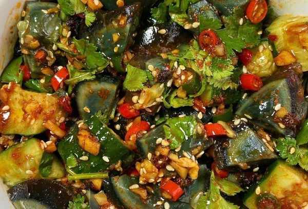 3、将凉拌酱汁倒入煮好的黄瓜蛋中,用手拌匀即可食用。