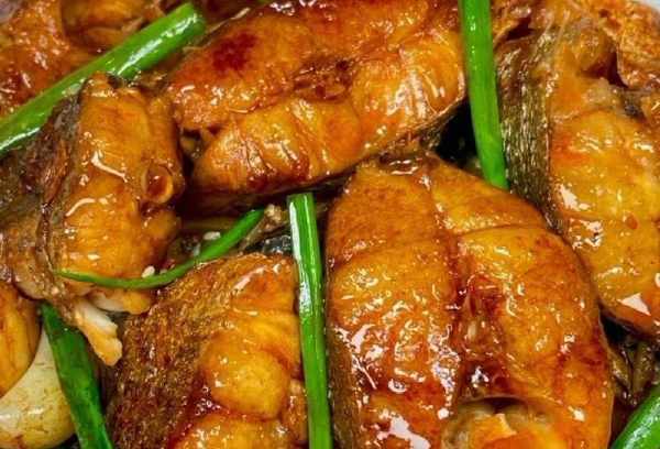 2.在平底锅中加热油。油热后,加入鲈鱼,炸至金黄色。服务并放在一边。