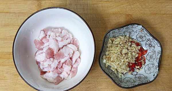 【第二步】:大蒜剁成蒜末,姜剁碎,辣小米切成圈,一起装盘。将五花肉切成薄片,放入碗中待用。