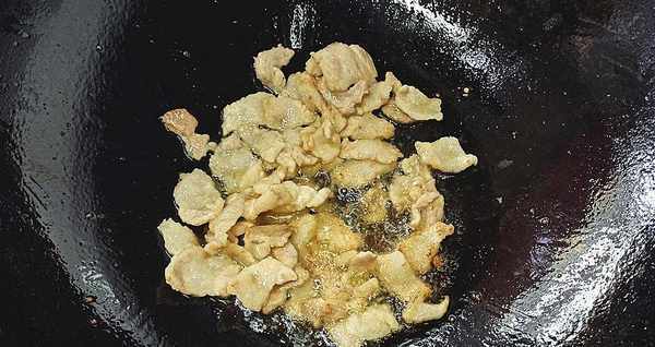 【第五步】:锅中放少许油,将五花肉倒入锅中小火炒出肥肉,将肉片炒熟。