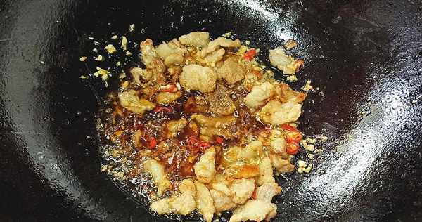 【第六步】:将肉片炒至油微黄,加入姜末、蒜末、小米翻炒香,再加入盐1勺、鸡精1勺、糖半勺、糖2勺生抽和蚝油各1勺,胡椒粉1勺。