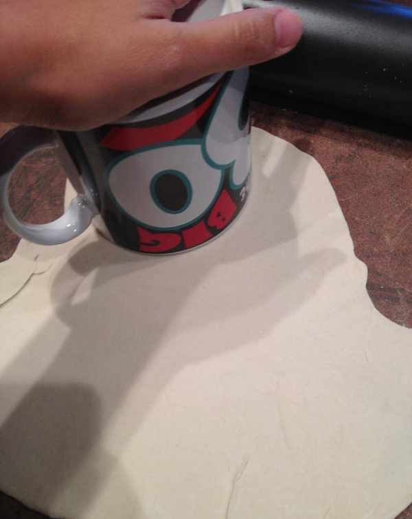将面团切成小块,揉成圆形,用擀面杖擀平,然后用杯子压出,做成饼皮。(这个杯子要比饺子皮大,如果馅太小,包到明年)