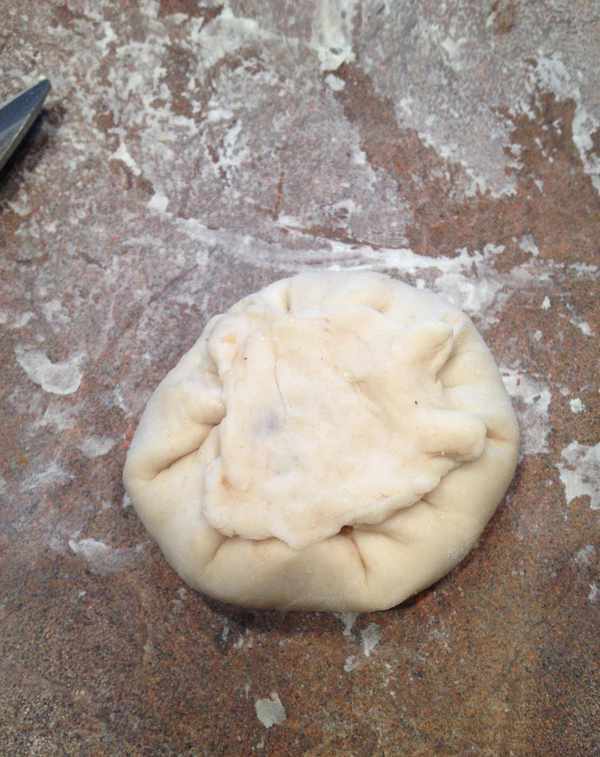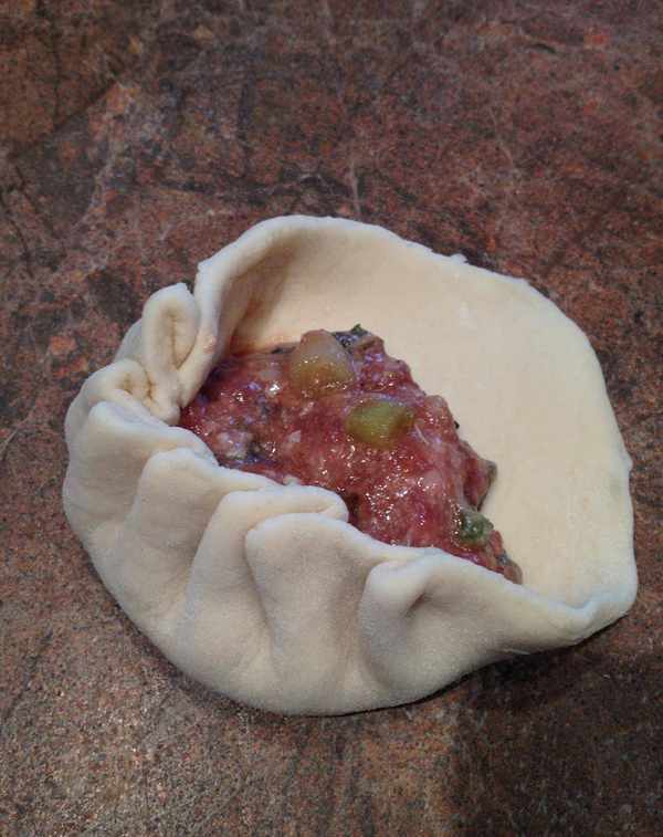 在馅饼皮周围拉一点,中间不要放太多肉。(如果不容易损坏)
