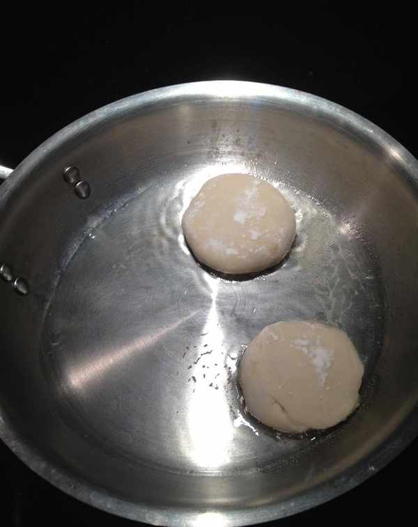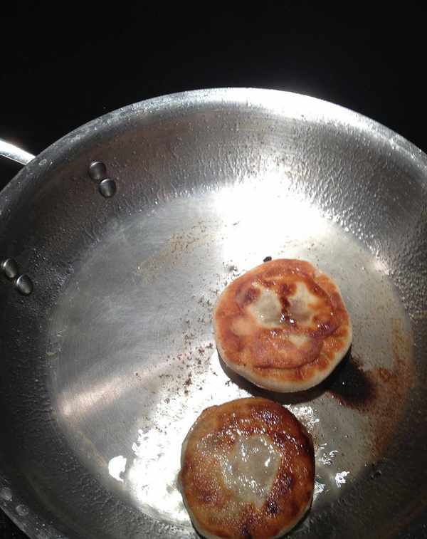 炸饼要油(跟葱油饼一样),所以要小火慢慢炸,让里面熟透。最后,起锅前先开火,两面煎十五秒,把油逼出来再起锅。