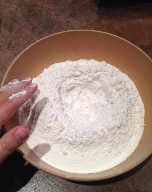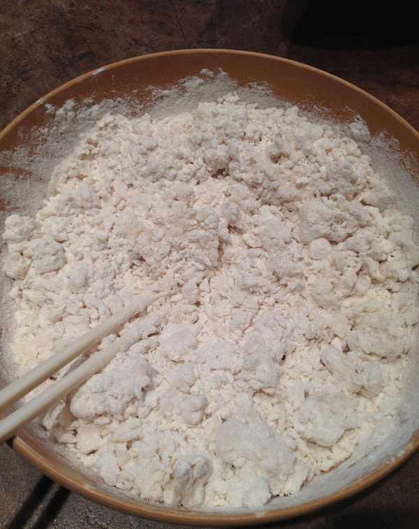 将面粉倒入碗中,撒上少许盐,慢慢加入开水,用筷子搅拌。(牛肉和面粉的具体比例我也不知道,反正粗略的想一下,多了就用来煮牛肉粥,面多了就炒一下,撒上糖粉。做饼干,总能找到配料)