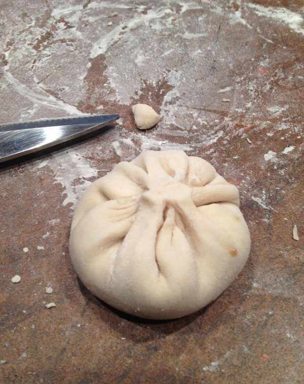 用剪刀剪掉多余的部分。(除非你是小笼包高手((如果是的话就不用看菜谱了)),手不要偶尔拉一下,很容易把饼皮撕破)