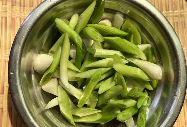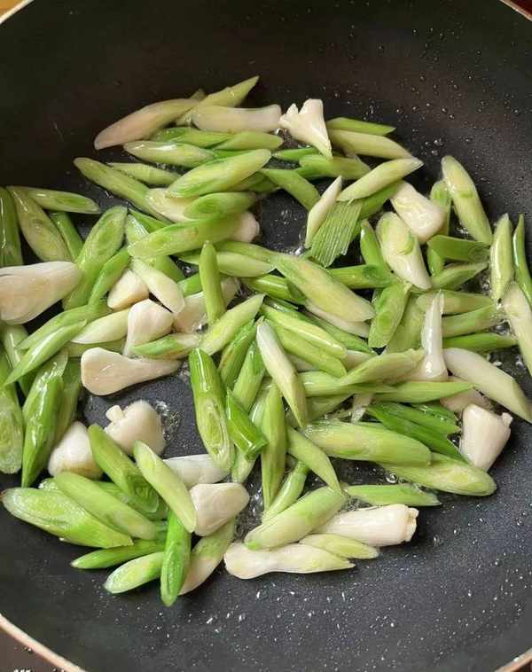 1、将准备好的葱苗用清水洗净,洗净后去掉表面的老药明,蒜苗洗净放在案板上,用刀切成小块备用。用法;