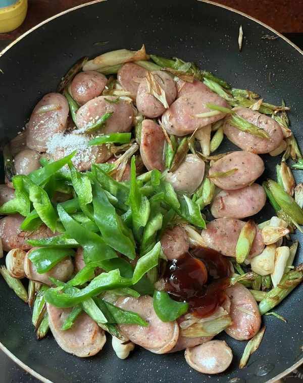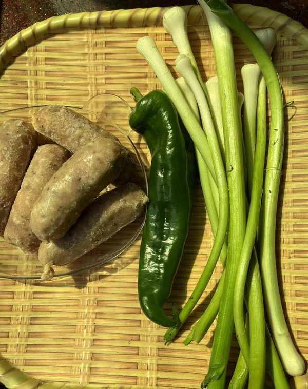青蒜、青椒、香肠、盐、食用油、蚝油