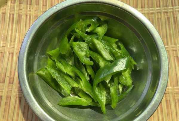 2、青辣椒用水洗净,洗干净后用手洗净。青椒洗净后,放在案板上用刀切开,切好留着备用;