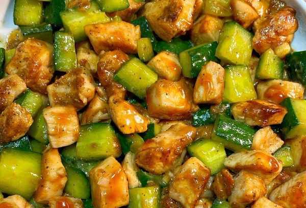 2、黄瓜表面抹盐,洗净切丁。大蒜切成蒜末。3.在平底锅中加热油。油热后放入腌制好的鸡胸肉翻炒至微黄,再加入蒜末翻炒出香味,再加入适量蚝油和黑胡椒调味,翻炒均匀入味,然后将其从锅中取出即可食用。