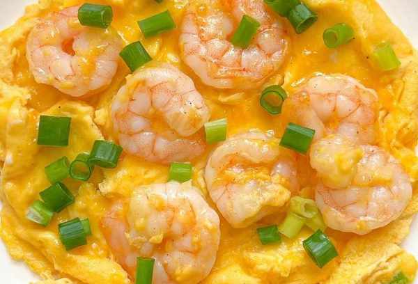 3.在平底锅中加热油。油热后,加入腌制好的大虾翻炒至变色。将其加入鸡蛋混合物中并充分混合。